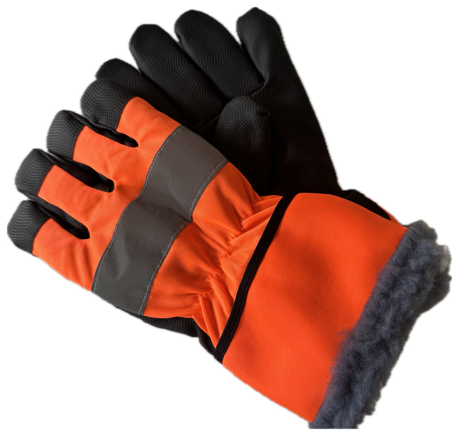 Synteettinen mikrokuitunahka, teddyvuori, huomiovärioranssi, heijastinnauha